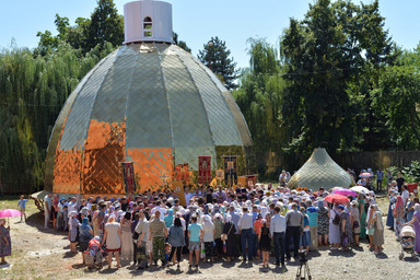 По прибытии в строящийся Свято-Успенский кафедральный собор состоялся молебен о приумножении любви. Владыка Тихон совершил чин освящения центрального купола и креста.